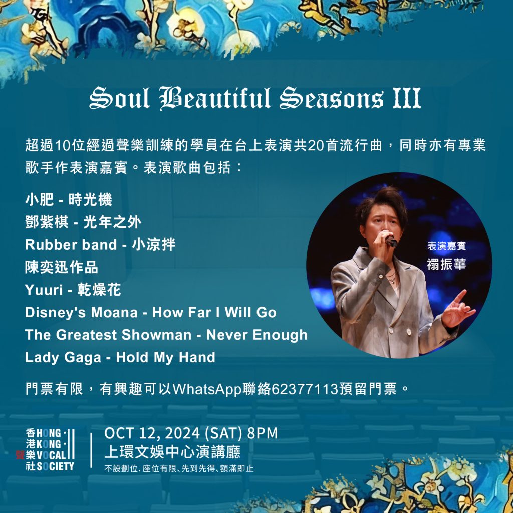 Soul Beautiful III作者: admin / 19 10 月, 2024 香港聲樂社Soul Beautiful IV 音樂會地點: 上環文娛中心演講廳日期: 2024年10月12號晚上8時正