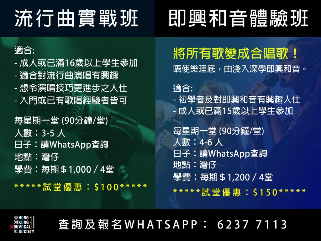 🔹 適合對象:成人或已滿16歲以上學生,對流行曲演唱有興趣,想令演唱技巧更進步之人仕,入門或已有歌唱經驗者皆可🔹 課程安排:每週一堂(90分鐘/堂)  🔹 班級人數:3-5人 🔹 …